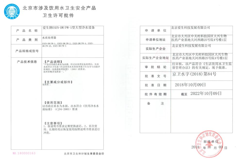 2018年8月底,愛生在長達(dá)十個月準(zhǔn)備的新一期衛(wèi)生批件申請,一次通過北京疾控中心組織的專家上會評審,產(chǎn)品及能力均獲專家首肯;2018年11月,經(jīng)北京市衛(wèi)生和計劃生育委員會批準(zhǔn),愛生拿到了第5張批件許可,成為北京地區(qū)為數(shù)不多的具備大型直飲水設(shè)備制造能力的專業(yè)企業(yè)。